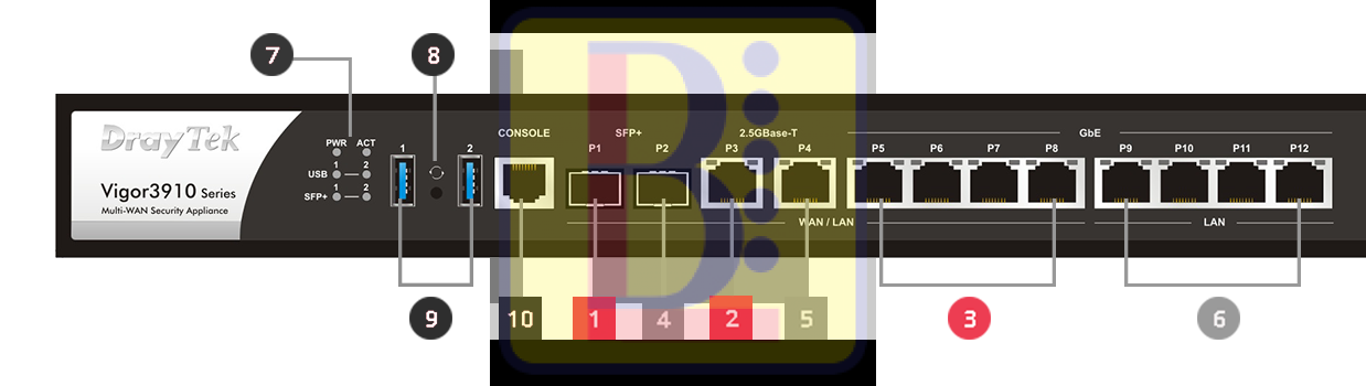 DrayTek Vigor3910 bao gồm 8 port LAN/WAN đáp ứng linh hoạt các yêu cầu mạng của bạn, trong đó có: