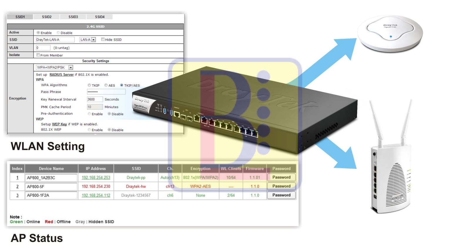 - Quản lý tập trung Access Point(APM) trên Vigor3910 cho phép bạn cấu hình đồng loạt VigorAP, kiểm tra kết nối..
