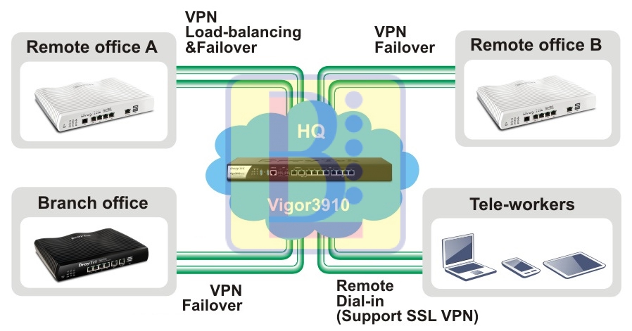 Với 8.5Gb/s NAT throughtput DrayTek Vigor3910 phù hợp với các ứng dụng mạng cho các doanh nghiệp vừa và lớn đòi hỏi nhiều băng thông. Tính năng LoadBlancing and Failover đảm bảo thiết bị hoạt động ổn định và tính dự phòng cao. Các WAN có thể được sử dụng WAN-Backup hoặc LoadBalancing với Policy-based Routing đảm bảo cho bạn có thể kiểm soát chính xác cổng và lưu lượng được định tuyến. WAN-Backup cung cấp tính năng dự phòng cho mạng của bạn trong trường hợp kết nối internet chính của bạn bị ngắt, khi đó lưu lượng truy cập sẽ chuyển về kết nối dự phòng. Đến khi kết nối internet chính được khôi phục lưu lượng truy cập sẽ được chuyển trợ lại kết nối chính.