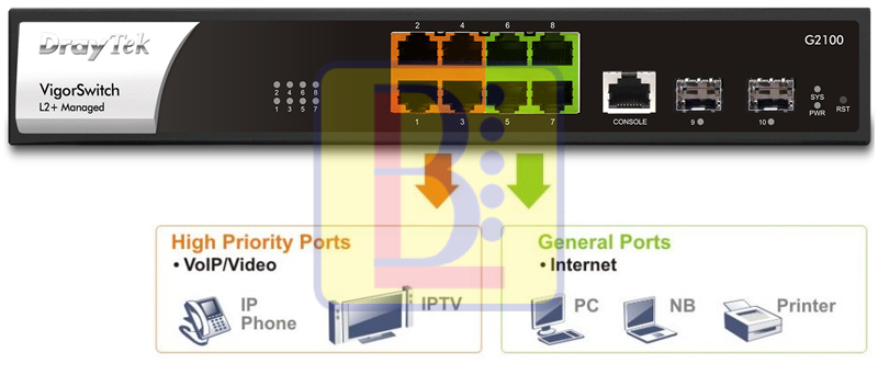 Khi lưu lượng truy cập lớn trên mạng LAN, tính năng QoS trên VigorSwitch G2100 giúp cải thiện đáng kể hiệu suất mạng bằng cách ưu tiên các truy cập quan trọng lên trước. VigorSwitch G2100 cho phép phân loại lưu lượng truy cập theo chuẩn 802.1p CoS, DSCP, IP Precedence phù hợp cho việc triển khai hệ thống IP camera, IP phone đòi hỏi chất lượng cuộc gọi và hình ảnh truyền tải ổn định.