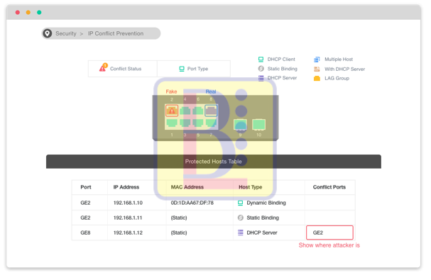 DrayTek VigorSwitch G2100 giúp bảo vệ hệ thống mạng khỏi những sự cố liên quan đến địa chỉ IP như: Thiết bị đặt trùng IP, có DHCP giả mạo trong hệ thống. Đây là những lỗi rất dễ gặp và sẽ dẫn đến mất mạng Internet, nhưng rất khó kiểm tra theo cách thông thường.